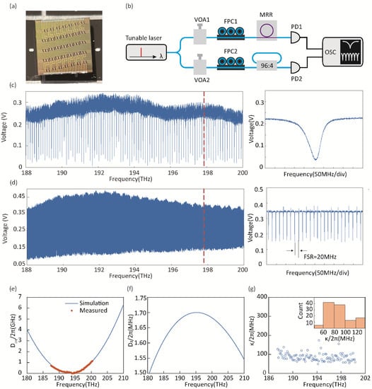 In our experiment, microresonator chips (Figure 1a) are fabricated at the foundry LIGENTECH, in which each resonator consists of a ring waveguide as the cavity and a bus waveguide for evanescent wave coupling to the cavity. The waveguide core is , and the cladding is .