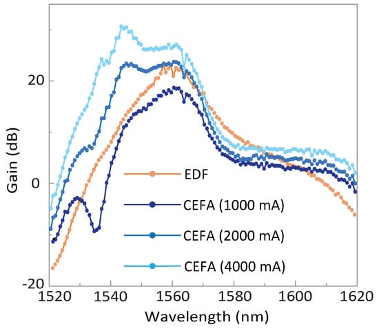 Gain performance using the commercial EDFA. The distribution of the net gain is recorded with the applied current at 1000, 2000, and 4000 mA (blue traces). To compare, the gain profile of the home-developed fiber is also presented (orange trace).