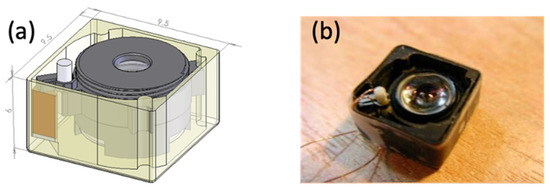 Figure 5. AF module with a Lobster USM. (a) The design. (b) The prototype with dimensions of 9.50 mm × 9.50 mm × 6 mm.
