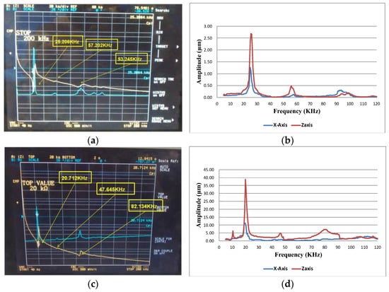Figure 11. (a) The frequency, impedance and phase analysis; (b) the displacement–frequency response diagram of the multi-layer bimorph stator; (c) the frequency, impedance and phase analysis; and (d) the displacement–frequency response diagram of the simple bimorph stator.