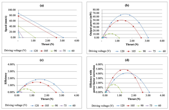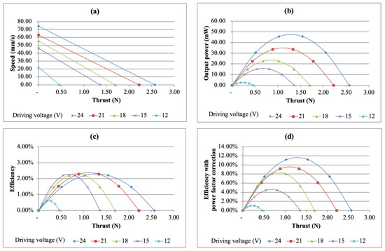 Figure 18. Performance of the multi-layer bimorph USM under different driving voltages. (a) Speed vs. thrust curve, (b) output power vs. thrust curve, (c) efficiency vs. thrust curve and (d) efficiency vs. thrust curve with a power factor correction.