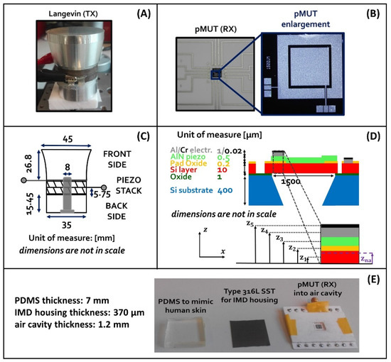 Elements constituting the UPD system. Langevin transducer (A); square pMUT (B); Langevin transducer geometrical dimensions (C); square pMUT structure (D); medium layers and air cavity structure for the pMUT placement (E).