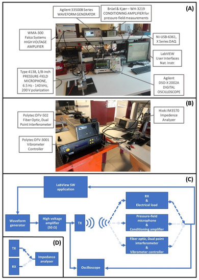 Experimental bench. Waveform generator, high voltage amplifier, conditioning amplifier for pressure-field microphone output, oscilloscope, and National Instrument DAQ and LabVIEW (A). Impedance analyzer and Polytec Vibrometer controller for dual point interferometer (B). Schematic block diagram of the circuit used for measuring the electrical power output on the load, the acoustic pressure field, and velocity and displacement values for the TX (C). Schematic block diagram to measure impedance and phase values of TX and RX (D).