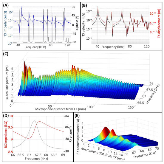 Characterization of the TX and the RX. Impedance and phase of TX (A); velocity and displacement of TX (B); TX acoustic pressure in air (C); impedance and phase of RX (D); RX acoustic pressure in air (E).