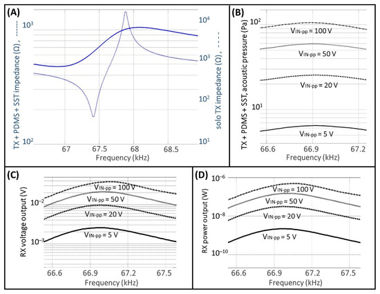 UPD system measurements. Comparison between the impedance value for the free TX and for the TX covered by the PDMS and the SST layer (A); acoustic pressure field (B); RX voltage output (C); RX power output (D).