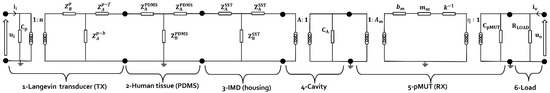 In the modeling of the UPD system shown in Figure 6, the pMUT is placed in the coupling cavity. The effect of the cavity on the pMUT performance is considered by introducing the acoustic compliance, . The following Table 5 resumes the values of the lumped parameters for the coupling cavity and the pMUT.