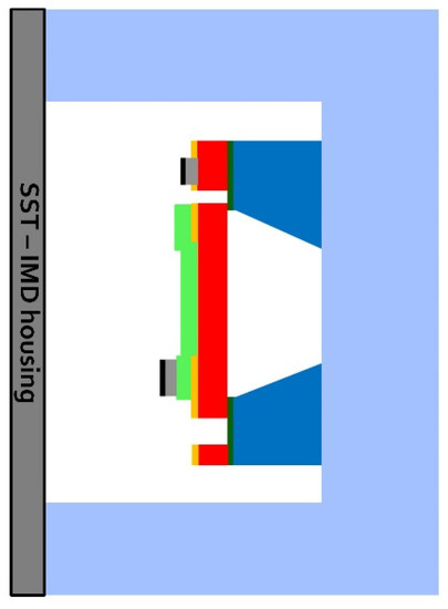 Regarding the medium layers, polydimethylsiloxane (PDMS) material—Sylgard® 184—was chosen to mimic the human skin because of its density and speed of sound values, which are like those of the body. The PDMS is formed by a base part and a curing agent, which were mixed at a ratio of 10:1. Then, the resulting compound was poured into a mold and later placed into a furnace at 70 °C for 2 h. The housing of the IMD is a thin layer of Type 316L SST. It is a bio-compatible material used for designing implants.