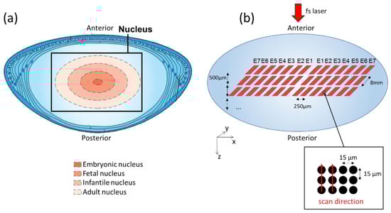 Femtosecond laser pattern on the crystalline lens nucleus. (a) Diagram of porcine crystalline lens anatomy (adapted from Ento Key, basic science of lens, https://entokey.com/basic-science-of-the-lens/, accessed on 3 October 2019) showing, on a cross section, the 4 layers from the adult to the embryonic nucleus; (b) 3D schematic of the single-pulse laser patterns with various energies and depths for the investigation of laser–lens interaction within the nucleus volume.