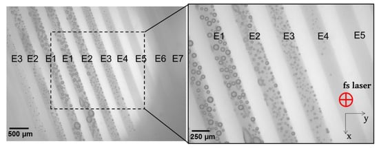 The large field of view allowed for visualizing of the modification caused by the laser treatment at all energy levels. Three types of interactions were identified, namely (1) marked bubbles with detectable coalescence, (2) small and sparsely located bubbles, and (3) no presence of bubbles but macroscopically opaque. Firstly, numerous gas bubbles were systemically observed in 19 out of 20 lenses in the zones having received a laser energy equal to or above 1 μJ (E4), which corresponded to a mean fluence of about 5 J/cm2. The bubbles’ size and density increased with the laser energy. Relatively large bubbles (up to 200 μm in diameter) were observed at 2.3 μJ (E1), as a result of a coalescence phenomenon of the small bubbles due to the small inter-spots space (15 μm). These bubbles remained until the histology sample preparation, which took place 24 h after fsL irradiation (details are presented in Figure 3 and Figure 4). Secondly, for the zones that received laser-pulse energy equal to or below 0.82 μJ (E5), visible/hardly visible or no bubbles were detected in 9 out of 20 lenses. Thirdly, a macroscopic and quite uniform opacification without bubbles was detected at 0.54 µJ (E7) in 4 out of 20 lenses. We also noted visible or hardly visible bubbles for all laser-pulse energy levels in 10 out of 20 lenses. The details of the interactions for each lens are shown in Figure 3.
