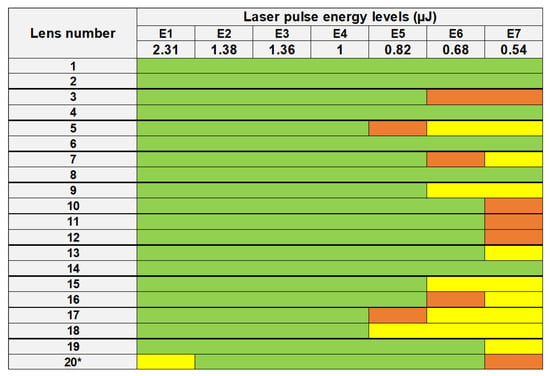 List of lenses treated by laser-pulse energy levels from 2.31 µJ (E1) to 0.54 µJ (E7). Marked bubbles with detectable coalescence (green), small and sparsely located bubbles (orange), and no bubbles but macroscopically opaque (yellow) are shown for each lens. A quite uniform opacification without bubbles was observed at 2.31 µJ (E1) for lens no. 20*. Pairs of lenses are separated by bold lines.