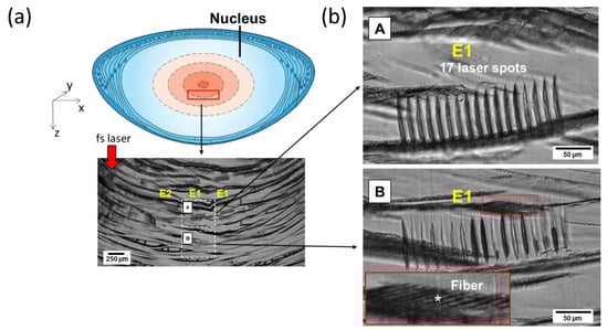 Microscopic images of 60 μm thick histological slices of typical laser-irradiated zones. (a) Scheme of the observed area within the lens with an overview of the various laser-impacted zones’ cross sections. (b) Magnified view of two zones of interest (A and B) exposed to the same laser-pulse energy and at a similar X–Y position within the lens but at different Zs. Wherever the irradiation sites are clearly observable and well contrasted, the fiber network (*) appears relatively unaffected.