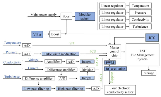 The sensor parameter acquisition module can be further divided into temperature, pressure, conductivity, and turbulence sensor modules. According to actual usage requirements, the sensor parameter acquisition module selects a relevant sensing function and uses a platinum-resistance-based device for temperature measurement, a four-electrode conductivity sensor for conductivity measurements, piezoresistive pressure for sensitive pressure measurements, and a vector turbulence sensor for turbulence measurements.