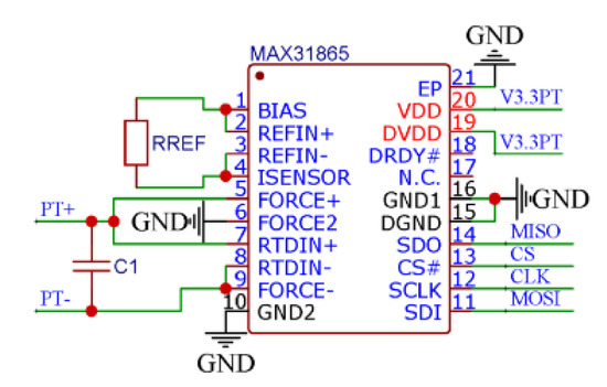 The temperature module converts the resistance changes into voltage changes for the purpose of easy signal processing to measure the platinum Resistance Temperature Detector (RTD). Therefore, it is necessary to ensure that the platinum RTD current is consistent with the reference resistance current. Thus, a MAX31865 conversion chip from MAXIM, which meets the requirements of the temperature module for efficient conversion of platinum thermal resistance, is used in this study. In addition, the MAX31865 conditioning chip has low system power consumption and 15-bit analog-digital converter (ADC) resolution, which enables it to maintain high precision under the premise of low power consumption when measuring the platinum thermal resistance. Furthermore, the MAX31865’s third-order digital “sin c” filter provides the input noise rejection function, thus reducing the 50-Hz or 60-Hz power supply noise, including harmonics of the power supply’s fundamental frequency, by 82 dB. The physical map of the used temperature module is shown in Figure 2.