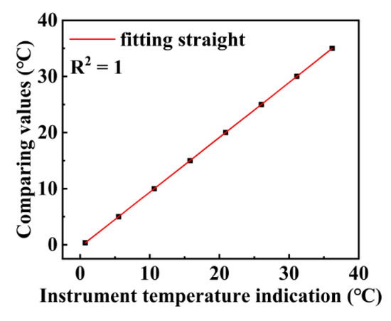 Figure 3 shows the comparison between the temperature values measured by the instrument used in this work and that provided by the National Center of Ocean Standards and Metrology. As shown in Figure 3, there exists a highly-linear relationship between the two temperature values. Specifically, in the temperature range from −5 to 40 °C, the difference between the output temperature values of the two instruments is only 0.02 °C.