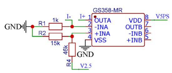 As shown in Figure 4, Gainsil’s GS358 is used to drive the pressure sensor with a 0.6 mA constant current. In particular, R2 and R4 are 15-kOhm and 46-kOhm resistors, respectively, and the reference voltage in the module is 2.5 V. Meanwhile, the positive input voltage of the operational amplifier is 0.6 V, and therefore, the negative input terminal voltage is also 0.6 V, due to the fundamental virtual short-circuit property of an operational amplifier. Since it is necessary to ensure the power supply of 0.6 mA constant current source to the sensor, R1 should have a resistance of 1-kOhm.