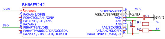 The pressure sensor has a differential output, where a single-channel voltage output is in a range of 70–130 mV; thus, the output amplitude of the differential signal of the voltage sensor is in a range of 0–60 mV. Due to the small amplitude of the voltage output, a high-precision ADC is essential. In addition, due to limited primary control resources of the storage circuit, this design performs the pulse width modulation on the voltage signal of the pressure sensor to output a PWM wave. As a result, the pressure changes are reflected in the duty cycle changes of a PWM wave. Therefore, a microcontroller must perform the signal conditioning on the pressure sensor. The BH66F5242 is an A/D type flash microcontroller with an eight-bit high-performance reduced instruction set and a built-in multi-channel 24-bit Delta Sigma type A/D converter. The BH66F5242 single-chip microcomputer is used in this work to adjust the pressure sensor signal, as shown in Figure 5, to meet the requirements of the ADC resolution and efficiently transform the voltage signal into a PWM signal.