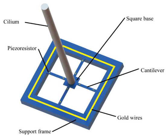 The proposed sensor consists of cilia, square cilia base, varistor, support frame, and on-chip gold wire. The cilia are located on the central base of the square shaped sensor structure and are connected to the support frame by means of cantilever beams. In addition, two varistors are placed on the upper side of each cantilever beam. Further, four cantilever beams are distributed in a cross shape, and cantilever beams in the same direction constitute a Wheatstone bridge [22]. Namely, the four cantilever beams are orthogonally placed and form two sets of Wheatstone bridges that sense the turbulent signals in mutually perpendicular directions. Moreover, the two Wheatstone bridges divide the measured turbulence signal acting on the cilia into x and y directions.