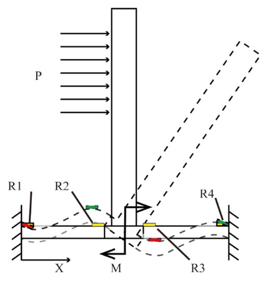 As shown in Figure 8, when the cilia are subjected to the turbulent force from the negative x-axis direction, varistors R1 and R3 are subjected to the compressive force, while varistors R2 and R4 are subjected to the tensile force [23]. Similarly, when the cilia are subjected to a turbulent force in the positive x-axis direction, varistors R1 and R3 are subjected to the tensile force, and varistors R2 and R4 are subjected to the compressive force. This means that when the cilia are subjected to turbulent flow, the force component in the x-axis direction will cause the resistance values of varistors R1 and R3 to change in a similar way. Meanwhile, the resistances of varistors R2 and R4 also change in a similar way. However, the changing trends of R1 and R3 and those of R2 and R4 are opposite. By analogy, the resistances of varistors on the y-axis also show the same changing principle. On the Wheatstone bridge, two resistors with the same resistance-changing trend are placed on the opposite bridge arms, while the two resistors with opposite resistance-changing trends are placed on the adjacent bridge arms. The magnitudes of the turbulence vector in the two directions are measured by the voltage outputs of two orthogonal Wheatstone bridges. When the cilia are not affected by turbulence, the bridge remains balanced, since the varistors’ resistances are the same. However, when the cilia are subjected to turbulence, the varistors’ resistances change by ΔR, and the resistance change induces a proportional output voltage. The bridge output can be expressed as follows: