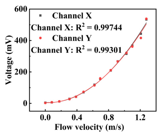 Next, the self-developed turbulence sensor has been calibrated, as shown in Figure 11, where the vertical axis represents the indication value of the turbulence sensor module of the self-developed instrument, and the horizontal axis denotes the turbulent jet velocity recorded by the turbulence sensor calibration system. In Figure 11, black points represent the turbulence sensor’s x-axis calibration data, while red points denote the y-axis calibration data. As shown in Figure 11, the relationship between the sensor output signal and the turbulent flow velocity follows the quadratic polynomial law. Furthermore, the x- and y-axis calibration data coincide, indicating that the two sensor outputs are highly consistent.