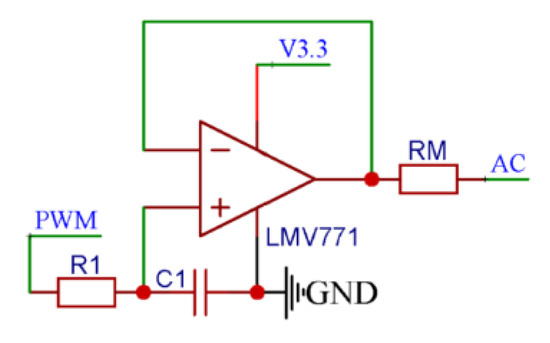 During the conductivity measurements process, the DC excitation and low-frequency alternating current (AC) excitation can lead to significant errors, and related studies have shown that when the excitation signal frequency is higher than 1 kHz, the conductivity measurement results tend to be stable with high reliability. The conductivity signal conditioning chip used in this design is an STM32F0 with a DAC of 12 bits, but its resolution does not meet the requirements for efficient MCU reconstruction of the excitation signal. Therefore, the proposed module uses a high-frequency PWM wave to output the AC excitation signal through the capacitor oscillator. As shown in Figure 12, the PWM wave output by the STM32F0 oscillated between R1 and C1, which yields a triangular wave input signal at the positive input end of the voltage follower. Then, the input signal is shaped by the voltage follower and output to create a triangular wave excitation signal with high-drive capability.