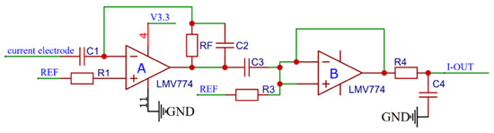 In addition, the current signal is converted into a voltage signal using a capacitor to measure the liquid current, as presented in Figure 14. At this time, the potential at the negative input terminal (pin 2) of operational amplifier A is consistent with the loop current change. Assume that the liquid to be tested is an unknown resistance RK, which is connected in series with the matching resistor RM. Moreover, assume that a negative feedback amplifier resistor RF is used to amplify the potential of pin 2. The RF resistance value should be set in a way that the current signal after conversion and amplification is not distorted.