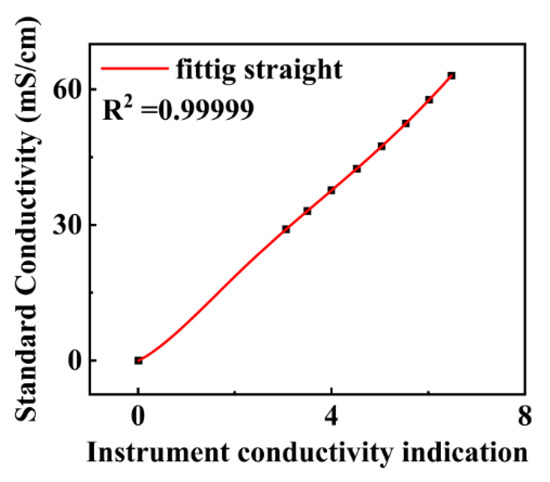 The conductivity module was calibrated at the National Center of Ocean Standards and Metrology. In Figure 15, the x-axis denotes the electrical conductivity output data of the self-developed instrument, and the y-axis shows the reference electrical conductivity value given by the National Marine Standard Metrology Center. In the range of 0–70 mS/cm, the self-developed instrument shows an error of less than 0.073 mS/cm.