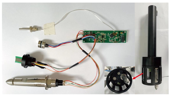 The entire hardware system was packaged into a device, as shown in Figure 16. The temperature, pressure, and conductivity probes were installed on the same plane, and the turbulence sensor probe was mounted on a plane that was higher than the other plane to ensure that the collected turbulence data would not be affected by the presence of the other probes.