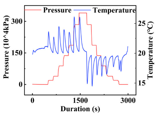 A host computer was used to process the data stored in the TF card, and its interface is presented in Figure 19. First, the system completed synchronous data recording from different sensors. Next, the data processed by the host computer were redrawn, as shown in Figure 20. Each pressurization step corresponded to the compression of the gas in the cabin, which caused the cabin temperature to sharply increase. Due to the constant temperature of the experimental environment and the large specific heat capacity of the water, the temperature dropped to the ambient temperature after the pressurization. In contrast, during the decompression process, due to the pressure reduction, the gas expanded, and the temperature in the cabin sharply dropped. Following the decompression, the cabin temperature increased to match the ambient temperature. In the pressure calibration experiment, the pressure and release processes were performed seven times. During the pressurization process, the pressure increased seven times, and the rising edge in each case was consistent with the rising edge of the temperature change. Meanwhile, during the pressure release process, the pressure was released seven times. However, due to mechanical problems, the theoretical last pressure release process actually corresponds to two pressure release steps, and thus, the temperature fluctuated eight times in total during the entire pressure release process. The fluctuations were highly consistent with the pressure changes. The pressure calibration experiment reflected the synchronization of the measurement system.