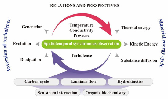 As depicted in Figure 21, the spatiotemporal synchronous observation of temperature, conductivity, pressure and turbulence is beneficial to study the mutual-driven mechanism of these four basic dynamic parameters. For instance, temperature and salinity differences in water can create turbulence, whose rate varies at different depths. The generated turbulence, in turn, accelerates the rebalance. The generation, evolution, and dissipation of turbulence all stem from the interaction between temperature and salinity differences in the water. It can also be used for turbulence inversion simulation, and turbulent mixing study on the meter or ten-meter scale after multiple collection points have been arranged in space to form a three-dimensional array. Furthermore, turbulence and these differences can strengthen the material energy cycle, which refers to thermal and kinetic energy transfer and matter diffusion. Therefore, the spatiotemporal synchronous studies of the interaction mechanism of dynamic parameters of seawater could promote marine research, on the carbon cycle, laminar flow, hydrokinetics, sea steam interaction, and organic biochemistry.