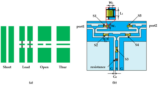 The device structure of the designed integrated electronic calibration chip is shown in Figure 1b in this paper. The chip presents a symmetrical structure, and S1–S5 represent RF MEMS switches. Structural design parameters are shown in Table 1. The device uses a coplanar waveguide as a signal transmission line and a tantalum nitride thin-film resistor as a load resistor [14,15]. By applying a DC control voltage, the state of the RF MEMS switch is controlled to achieve switching between different calibration states [16]. When calibrating port 1, the signal is grounded by controlling the switch S1 to realize the short-circuit calibration state. An open calibration state is achieved when all switches are open. When switches S2 and S3 are controlled so that port 1 is connected to the load resistance, the load calibration state is realized. When switches S2 and S4 are controlled, a through calibration state between port 1 and port 2 is achieved. Similarly, the calibration process of port 2 is the same as above. The corresponding switch mode of the calibration state is described in Table 2.
