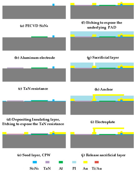 Figure 3 is a process flow diagram of an electronic calibration chip based on a RF MEMS switch. The device uses borophosphosilicate glass (dielectric constant of 4.9) as the substrate material. A 500 nm thin film of silicon nitride (Si3N4) was grown at 350 °C via the PECVD process and etched to form switch contacts, as shown in Figure 3a. Next, 500 nm aluminum (Al) was grown via the magnetron sputtering process and etched in phosphoric acid solution (H3PO4) at 50 °C to form the switch-driving electrodes, as described in Figure 3b. Under the condition of RF power of 300 W and airflow of 200 sccm, tantalum nitride film was grown via magnetron sputtering for 10 min as the load resistor in Figure 3c. A silicon nitride film of 300 nm was grown as an isolation layer to avoid electrical breakdown easily occurring during device operation, and exposing the TaN resistance by etching, shown in Figure 3d. Additionally, 50 nm/150 nm Ti/Au was grown as a seed layer, and 2μm gold was prepared via a micro-plating process as a coplanar waveguide for RF signal transmission in Figure 3e. A Ti/Au seed layer was removed via wet etching. The silicon nitride isolation layer was etched by photolithography and dry etching to expose the underlying PAD in Figure 3f. From Figure 3g, spin-coated polyimide was used as the sacrificial layer of the device, and precured at 80 °C for 5 h. After the anchors in the sacrificial layer were obtained by a mask and wet etching, the sacrificial layer was cured at 300 °C in Figure 3h. Then, 100 nm gold was sputtered as the seed layer, and the top electrode of the switch was fabricated by a micro-electroplating process at 60 °C, as shown in Figure 3i. Under the condition of radio frequency power of 400 W, the sacrificial layer was etched by oxygen plasma to release the sacrificial layer, shown in Figure 3j. The surface structure of the device prepared by the surface micromachining process is shown in Figure 4, and the detailed structure of the RF MEMS switch in the device is shown in Figure 5.