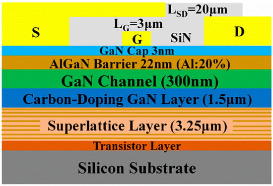 The AlGaN/GaN heterostructures were grown on a 6-inch silicon substrate by metal-organic chemical vapor deposition (MOCVD), as shown schematically in Figure 1. The AlGaN/GaN HEMT structure consists of an AlN nucleation layer, a superlattice transition layer, a C-doped GaN layer, a GaN channel layer, and 22 nm Al0.25Ga0.75N barrier layer. The mesa isolation was performed by BCl3 + Cl2 mixed gas plasma etching. To perform the Ohmic contact formation at source and drain, Ti/Al/Ni/Au was deposited by e-beam evaporation and was annealed by rapid temperature annealing (RTA) at 840 °C for 30 s in N2 ambient. The Ni/Au (50/300 nm) Schottky gate contact was deposited by the electron beam evaporation. Finally, 20 nm SiN was deposited as a passivation layer. The source-drain length, gate length, and gate width were maintained at 20, 3, and 25 μm, respectively. The buffer stacks can be considered insulated capacitors when the leakage current of each layer is smaller than the “displacement current”; i.e., IDISS = CTOTdVSUB/dt, CTOT is the series combination of the capacitances of UID GaN, C-doped GaN, and superlattice transition layer, respectively [].