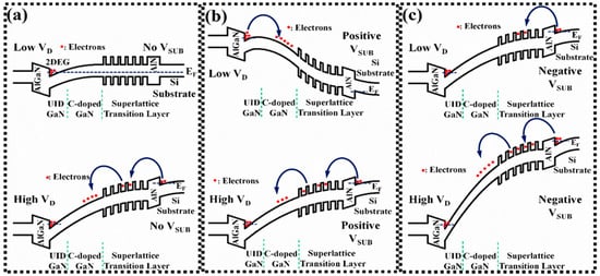 As shown in Figure 2, the buffer trap charging/discharging mechanism of HEMT devices with a superlattice transition layer is demonstrated schematically. The substrate of GaN-on-Si power HEMT can be used as an independent contact terminal for applying VSUB []. The VSUB can modulate the 2DEG concentration through the back-gate effect. Figure 2a shows that the buffer acceptor and donor traps are partly ionized and neutralized at the initial state. The un-ionized neutral donor/acceptor traps may exist in the UID/C-doped GaN layer. The opposite doping polarities may lead to the formation of the p–n junction at the UID/C-doped GaN interface [,,].