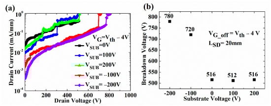 Figure 5 shows the BV characteristics measured using off-state leakage current with the positive/negative VSUB. Figure 5a,b show that the negative VSUB can increase the BV due to the increased ionized donor trap concentration. The BV was measured starting from VD = 0 V and gradually increased in voltage by 2 V/s. The electrons forming in the inversion layer between the Si substrate and AlN layer slowly accumulate energy to overcome the energy barriers to inject into the buffer stack. The electrons injected into the buffer layer have a sufficient reaction time to neutralize the ionized donor trap in the UID GaN with a positive charge. The ionized donor trap is more critical to BV than the ionized acceptor trap due to the alleviation of the non-uniform distribution of the high electric field caused by high VD []. Applying the negative VSUB (or positive Vtop-to-sub) causes the donor/acceptor traps to ionize at the UID/carbon-doped GaN interface []. An increase in ionized donor trap concentration with a moderate acceptor trap can increase the BV and reduces the off-state leakage current []. Therefore, the concentration of ionized donor trap and BV increase when a negative VSUB is applied. On the other hand, Figure 2a,b show that the electrons from the 2DEG channel or the Ohmic contact are primarily injected into the buffer layer to increase the ionized acceptor traps without decreasing the concentration of the ionized donor traps []. The BV at the applied positive VSUB and VSUB = 0 are very similar due to the same concentration of ionized donor traps.