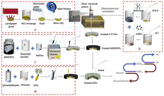 Materials: All reagents were applied without additional purification. Specifically, aniline (C6H7N) and chitosan (CS) were obtained from Macklin Biochemical Co., Ltd. (Shanghai, China). Hydrochloric acid (HCl, 36.5 wt%), nitric acid (HNO3) and isopropanol (C3H8O) were purchased from Yongfei Chemical Reagent Co., Ltd. (Shaowu, China). Ferrocene (C10H10Fe) and glucose anhydrous (C6H12O6) were obtained from ZhiYuan Reagent Co., Ltd. (Tianjin, China). Bovine serum albumin (BSA) phosphate buffer saline (PBS) and glutaraldehyde solution (CHO(CH2)3CHO, 5 wt%) from Phygene Biotechnology Co., Ltd. (Fuzhou, China). MWCNTs were purchased from Tanfeng Tech. Inc. (Suzhou, China). 5 wt% DuPont Nafion solution from Sigma-Aldrich lab & production materials Co., Ltd. (Shanghai, China). Glucose oxidase (GOx) was bought from Ekear Biotechnology Co., Ltd. (Shanghai, China).