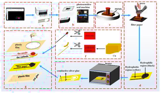 The structure and parameters of the detection chip are shown in Figure 2. First of all, the hydrophilic and hydrophobic areas are printed on the filter paper using atom stamp printing technology. The detailed procedures are shown as follows. Figure 2a shows step 1 is to print the required figures on the acid paper. Step 2 is to expose the diagram on the stamp with a photosensitive seal machine as shown in Figure 2b. Step 3 is to put the stamp into the PDMS solution and immerse for 30 min, after exposing at 350 °C. Step 4 is to stamp the pattern on the filter paper for 2 min. Then, the filter paper is to be placed into a heater to heat until the hydrophobic channel is formed and the conductive silver glue is brushed onto it. The next step is to conceal the hydrophobic area by plastic film, which cuts the hydrophilic microchannel for the electrode and conductive layers by a laser engraving machine. Finally, the anode is packaged and the cathode on the reserved hydrophilic microchannel is glued using 3M glue, as shown in Figure 2g.