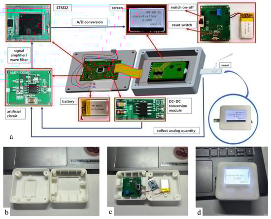 The portable sweat detection device: (a) internal structure diagram. (b) 3D printing shell. (c) real internal photo. (d) real detection device photo.