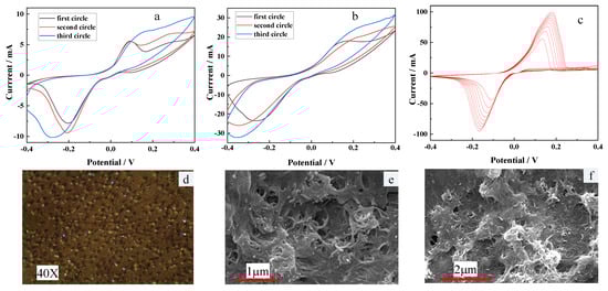 As shown in Figure 4a, b, it can be clearly found that the peak current of the CV curve of F-P film prepared by separate electroplating is about 30 mA, which is significantly higher than that of F-P film (about 10 mA) prepared by mixed electroplating. Figure 4c shows the CV curves of F-P film prepared by electropolymerization. It can be seen that obvious redox peaks appear in the process of electropolymerization. With the increase of scanning times, the peak potentials of redox peaks move from −0.19 V to +0.19 V, and the peak currents gradually change from ±50 mA to ±100 mA. By analyzing the CV curve, it can be seen that the voltage difference between the two peaks is 0.38 V, which shows that the electrolytic solution and CV scanning parameters used by our experimental team can well attach a layer of F-P film to the Cu substrate. Figure 4d is a 40-times electron micrograph of F-P film. It can be seen that the F-P film is brownish yellow and covered with golden particles. The modified MWCNTs were characterized by SEM. As shown in Figure 4e,f, after nafion dispersion and ultrasonic treatment, the carbon nanotubes are flocculent on the electrode, which increases the surface area of the working electrode and is conducive to improving the electron transfer rate and the immobilization effect of the enzyme.