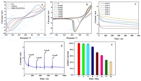 The electrochemical characteristics of the fabricated electrodes were tested before they were used in the sensor. Figure 5a shows the CV curves of different modified Cu electrodes (bare Cu, F-P/Cu, MWCNTs/F-P/Cu) at the same scanning rate and scanning range (−0.3 V to +0.3 V, 0.01 V/s). It can be seen that all electrodes have clear redox peaks in the range of −0.3 V to +0.3 V. With the increase of surface modifications, the redox peaks also increase, which indicates that the prepared F-P film and MWCNTs have good nanostructure and electrochemical properties, effectively improving the electron transfer rate. Figure 5b shows the CV curves of the final electrode (GOx/MWCNTs/F-P/Cu) in different concentrations of glucose solution (0, 0.1, 0.3, 0.7, 1.0, 1.3, 1.7, 2.0 mM). As shown in the figure, the size of the CV curve is obviously proportional to the glucose concentration, and the shape of all curves are almost the same, with clear redox peaks. With the increase of glucose concentration, these peaks showed a regular gradient slope, and there was no significant potential shift between the peaks. The peak currents of redox reaction gradually change from +4 mA and −3 mA to +10 mA and −11 mA. In order to optimize the working potential of the glucose sensor, six different potentials (0.10, 0.15, 0.18, 0.22, 0.25 and 0.30 V) were selected in the potential range of +0.1 V to +0.3 V, and the current response was tested in the glucose solution with a concentration of 1.0 mM by chronoamperometry. As shown in Figure 5c, with the increase of potential, the current responses increase gradually, and the strongest current signal response is observed at 0.3 V. However, it can also be seen that the current response at 0.3 V is not as smooth as other groups of curves, which may be due to the instability of the electrode performance at high potential. Therefore, we decided to use 0.25 V as the working potential of the sensor. In order to further study the current response at this potential, the chronoamperometry test was carried out on the electrode at 0.25 V, and the results are shown in Figure 5d. When 0.1 mM glucose was added into the PBS buffer at 100, 300, 500 and 700 s, the current response changed significantly within 10 s, which indicated that the electrode was highly sensitive to glucose concentration with good test results at 0.25 V. In order to evaluate the effective working time of the prepared electrode, the electrode was stored in the indoor environment, and its maximum current response in 1 mM glucose solution was measured and recorded daily for 20 days. As shown in Figure 5e, the maximum current in the first 8 days was relatively stable, and it began to decrease significantly until the 9th day, reaching 60% of the original maximum current on the 12th day and 45% after 20 days. It can be seen that the electrode has a long working time, and the effective working lifetime is up to 8 days.