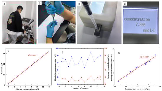 The experiments of sweat sampling and glucose detection. (a) exercise for sweat sampling. (b) sampling with a pipette. (c) analysis with the device. (d) the analysis result displaying on LCD. (e) The relationship between response current and glucose concentration of artificial glucose solution. (f) The results of volunteers’ blood glucose concentration and response current of sweat. (g) The correlation degree between response current of sweat and blood glucose concentration.
