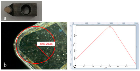 Single-crystal copper with (111) crystal plane was applied as a workpiece material in this work. In line with the dimensions of the machine-tool worktable, workpiece samples were pre-machined with the sizes of Φ150 × 25 mm. Single-crystal diamond is the perfect material for the cutting tool, due to its outstanding properties such as ultra-high hardness, low friction-coefficient and a cutting edge of high sharpness. The used single-crystal-diamond tool was prepared by Shanghai Suporhard Tools Co., Ltd. The single-crystal-diamond tool exhibits the rake- and flank-angle parameters of 0° and 5°, respectively, and its tool nose-radius was 1 mm, as shown in Figure 1. Roughness of tool surface greatly affects the friction properties between the tool and workpiece surface during the cutting process. Roughness of rake and flank surface were assessed as approximately 1.46 nm and 104.28 nm, respectively using the atomic force microscope (Alpha 300RA, WITec, UIm, Germany). As shown in Figure 1c, the edge radius of this used single-crystal-diamond tool was measured to approximately 115 nm.