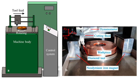 Single-point diamond turning (SPDT) has been extensively applied in many precision and ultra-precision machining fields, for example, optical lens, optical reflector, disk base, etc. It can achieve excellent dimension-accuracy and good surface-roughness on the nanoscale, by using natural-diamond cutting tools [1,2]. The high-precision parts made of nonferrous materials, such as various single-crystal and polycrystalline metals, are very suitable for production with SPDT [3,4]. SPDT has been a research hotspot in the mechanical-machining field for a long time. As a single-crystal metal, single-crystal copper is commonly used to produce optical reflectors and various substrate materials, owing to its good electrical and thermal conductivity and chemical catalytic-performance, as well [5]. Lee et al. [6] investigated the surface-quality anisotropy on machined surfaces in the diamond cutting of single-crystal copper, and the best machining-direction was suggested. The effect of machining parameters in the nanocutting of a single-crystal-copper workpiece was studied by Zhang et al. [7], who found the depth of cut showed a significant influence on the defect layer. Because of its softness feature, single-crystal copper is easy to cut, but relatively difficult to grind, due to the blockage of the grinding wheel. Hence, SPDT becomes one of the ideal and commonly used methods for ultra-precision machining.