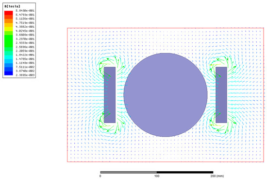 To research the influence of magnetic-field action on the metal-cutting process, the magnetic-field distribution is simulated with the software Maxwell. The corresponding simulation-model and boundary conditions are consistent with the magnetic-field-assisted turning. The magnet is neodymium iron N35H with same remanence and coercive force as the cutting experiments. The magnetic-induction-line distribution with and without the workpiece is shown in Figure 3. Before putting in the workpiece, the magnetic-induction line in the zone between the two permanent magnets is even, from the N pole to the S pole. In comparison, it is found that the magnetic-induction line exhibits no obvious variation with and without the workpiece. With the magnetic-induction-intensity measurement at five different positions on the workpiece surface, the results also indicate that the magnetic-induction intensity has no variety after the workpiece placing.