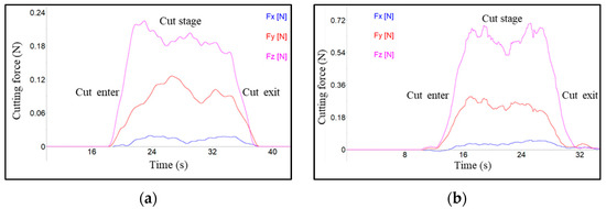Figure 5 shows the cutting-force-signal waveform that was recorded with and without the magnetic field in the turning process. The cutting-force directions in the turning experiments are illustrated in Figure 2b; among the three cutting-force components, tangential force, Fz, is the largest, second is the normal force, Fy, and the radial force, Fx, becomes the smallest. The depth of cut (4–12 μm) is much smaller than the tool-nose radius (1000 μm). Only the partial tool-nose assists in the metal-cutting process. This is the reason why the effective tool-cutting edge angle is very low, and is calculated to be less than 0.7°. Hence, the main components of the resultant force are distributed in a tangential direction, Fz, and a normal direction, Fy. The component of the resultant force in a radial direction, Fx, is very small, and close to zero, and it is difficult to acquire an accurate value. Hence, the subsequent analysis of the cutting force is mainly focused on the tangential and normal force. By comparison, it is found that the cutting-force waveform characteristics of magnetic-field-assisted and conventional turning, are similar. The cutting-force-signal waveform can be divided into three stages: the cut-enter stage, with rapidly increasing force, the cut stage, with stable force, and the cut-exit stage. with decreasing force. The average value of the cutting force in the stable stage was employed as the cutting-force result.