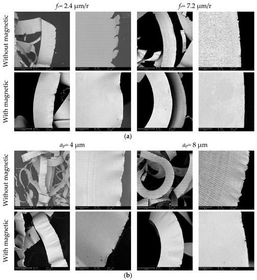 Effect of magnetic-field-assisted turning on chip morphology, (a) chip morphology varying with feed rate, (b) chip morphology varying with depth of cut, (c) chip morphology varying with cutting speed.