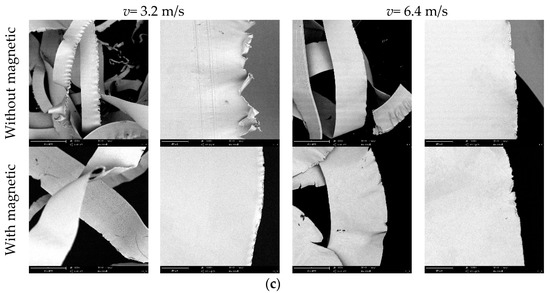 Through the comparison of chip morphology in magnetic-field-assisted turning and conventional turning, it is found that the chip width becomes larger after introducing the magnetic-field action into the cutting process. Because of the plastic deformation of the formed chips, the chip thickness usually increases and becomes larger than the uncut-chip thickness; however, chip length and width usually decrease and become smaller than the actual cutting distance and cutting width. The chip-compression ratio is calculated by cutting width divided by chip width. From the results, it is revealed that the chip-compression ratio in magnetic-field-assisted turning is smaller than that of the traditional turning. It is known that the friction coefficient on the rake face in magnetic-field-assisted turning is smaller, and this factor helps to obtain the smaller chip-compression ratio. The curling and tearing features of the chip-side morphology obviously reduce in magnetic-field-assisted turning. This results also reveal the lower amount of chip deformation in magnetic-field-assisted turning. According to the literature [28,29], the magnetic-field action can increase the workpiece-material plasticity, based on the magnetoplasticity mechanism, because the magnetic field can promote a dislocation motion in the tensile quality of the material. The better material-plasticity usually leads to the smaller chip-compression ratio in the metal-cutting process, as well. These factors in magnetic-field-assisted turning are helpful for alleviating the severe extrusion and the material plastic side-flow in the metal cutting process, and the trend is to improve metal machinability.