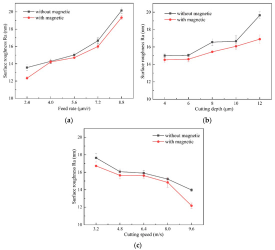 Effect of magnetic-field-assisted turning on surface finish, (a) surface roughness varying with feed rate, (b) surface roughness varying with depth of cut, (c) surface roughness varying with cutting speed.
