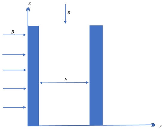 Let us consider an MHD convection flow through the microchannel of electrically conductive (Cu-Ag-TiO2) tri-hybrid nanoparticles, as shown in Figure 1, under the following constraints. The microchannel length is infinite, with width h. The channel is along the x-axis and is normal to the y-axis. At , the temperature of the system is . After , the temperature increases from to . The fluid accelerates in the x-direction. A magnetic field of strength works transversely to the flow direction.