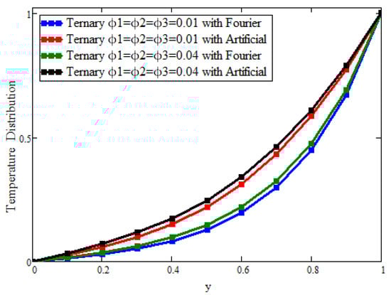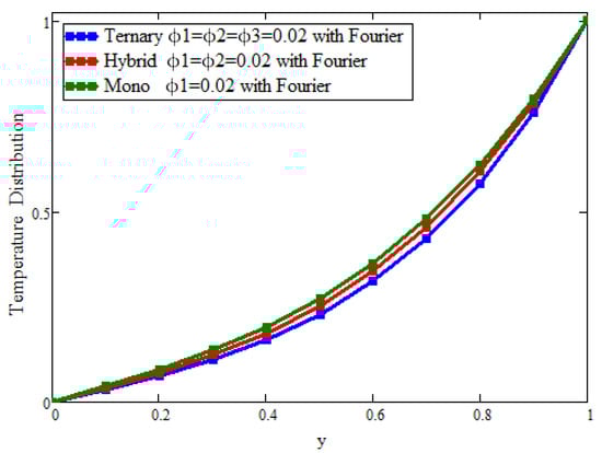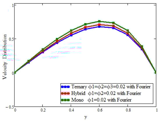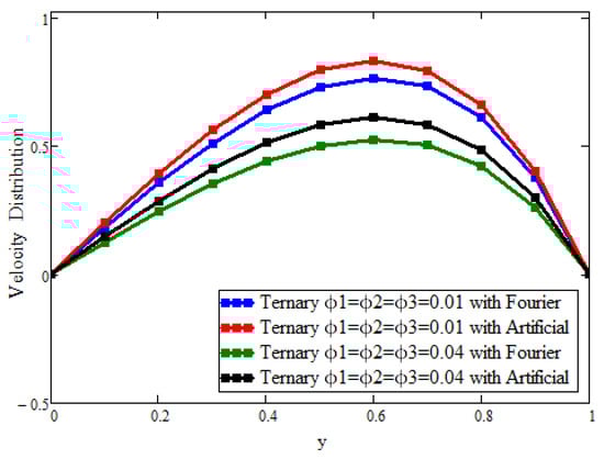 Figure 2 and Figure 3 present the behavior of the concentrations of the three types of nanoparticles for the temperature and velocity fields, respectively. It is clear in Figure 2 that the temperature can be enhanced to its maximum, unlike with hybrid and mono-nanoparticles. Due to the increase in the concentration of ternary nanoparticles, the thermal conductivity and, hence, the temperature increase. Figure 3 depicts the outcomes for the velocity to see the impact of the volume fraction ( = = = 0.02). It is found that the velocity is a decreasing function of the concentration of the nanoparticles, and the maximum decline can be observed, unlike with hybrid and mono-nanoparticles. Physically, this is due to fact that increasing the concentration causes the fluid to become more thick; the space between the layers is reduced and, ultimately, the fluid flows slowly.