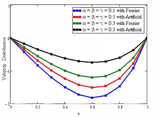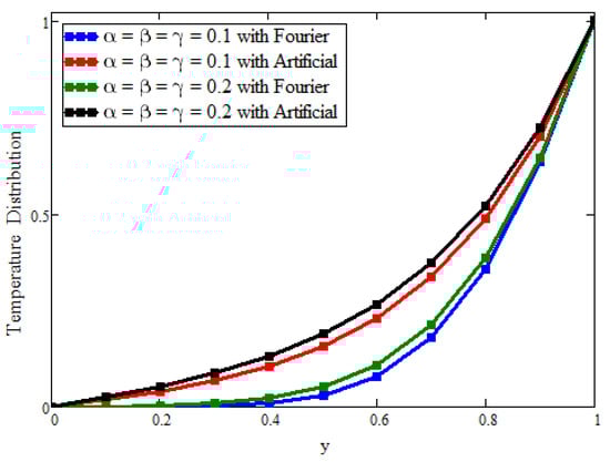Figure 6 shows only the effects of ternary nanoparticles with the Fourier law and replacement. Taking = = = 0.01 for the solutions, it was found that the ternary nanoparticles with the Fourier law predicted a greater enhancement in the temperature than that predicted in the artificial case. On the other hand, by increasing the concentration from 0.01 to 0.04, the temperature also increased, which supported the physical reasoning of the fluid temperature. Figure 7 plots only the effects of the ternary nanoparticles with the Fourier law and replacement. Taking = = = 0.01 for the solutions, it was found that the ternary nanoparticles with the Fourier law predicted a greater decline in the velocity than that predicted in the artificial case. On the other hand, by increasing the concentration from 0.01 to 0.04, the velocity was also decreased, which supported the physical reasoning of the fluid velocity.